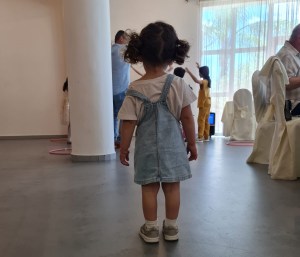 Τραβά μου το φουστάνι μου. Ανάσα. Τίποτε που τούτα εν εσυνέβηκε (ακόμα). Εξακολουθώ να είμαι καλή μάμμα. Γονατίζω για να τη θωρώ μες τα μάθκια. Εθκιάβασα ότι πρέπει να κατεβαίνεις στο ύψος τους για να έσιει αποτέλεσμα τούτο που θέλεις να τους πεις.